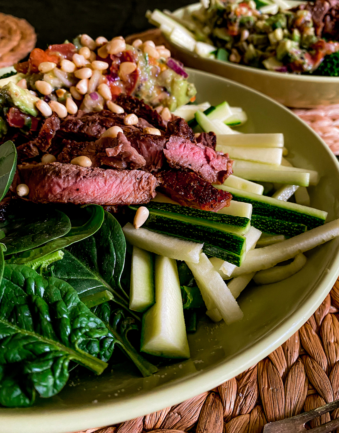 Выкладываем стейк, шпинат и цукини, заправляем все соусом гуакамоле!