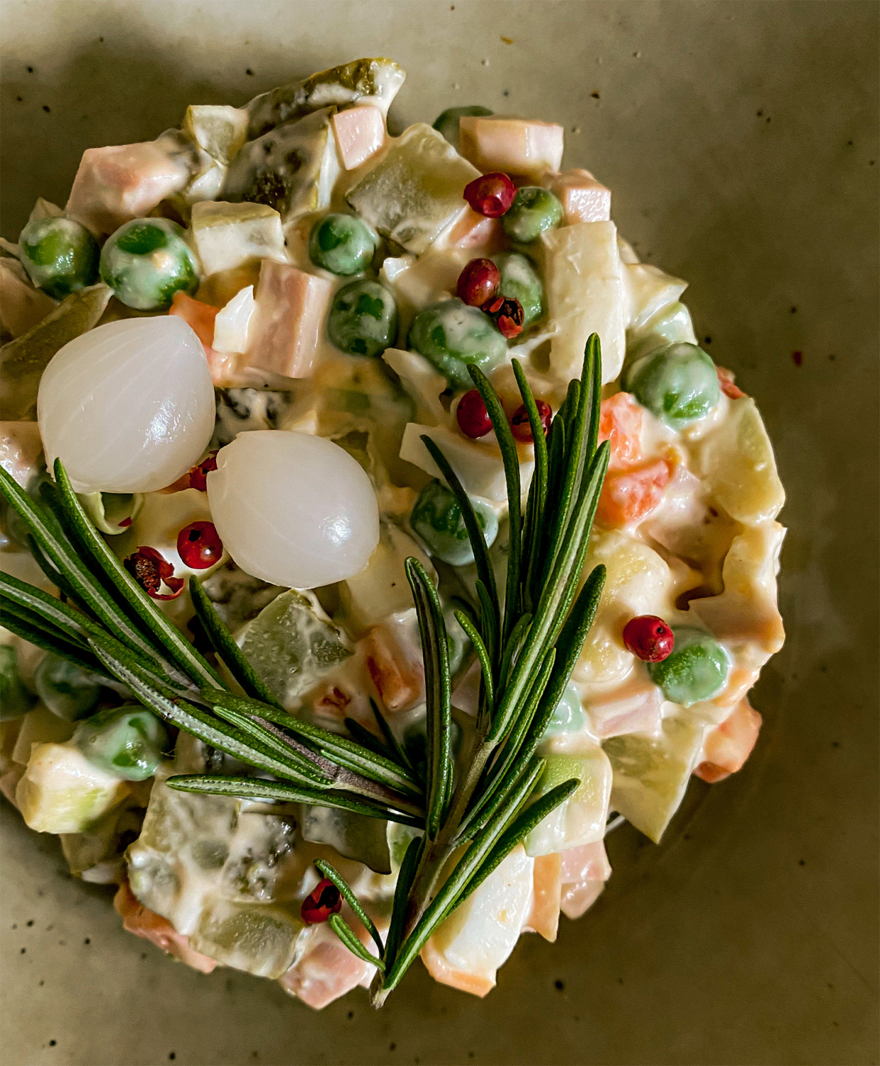 Но вот пара маринованных луковичек сверху — добавляют и вкусовой акцент, и декор тоже нетривиальный!