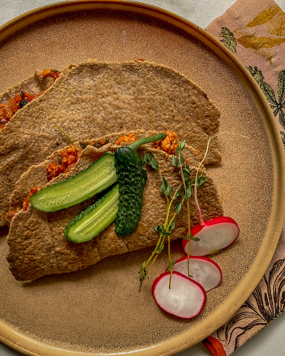 Просто собираем: на половинку лепешки накладываем фарш, посыпаем зеленью или тертым козьим сыром и едим.