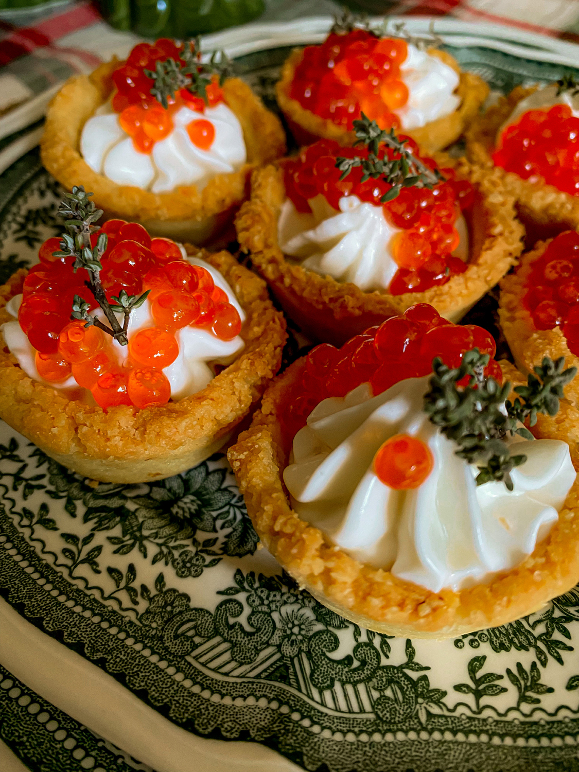Сама сборка: отсадить в корзиночку крем, добавить сверху немного икры, чтобы шапочку крема было видно. Украсить веточкой тимьяна.