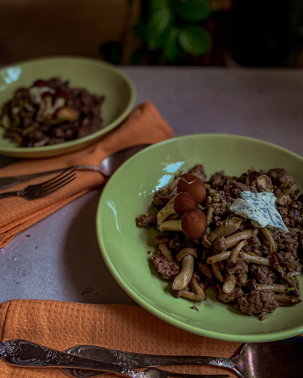 Добавляем к фаршу пару зубчиков чеснока и зелени (у меня тимьян). Когда фарш зарумянился — добавляем грибы, перемешиваем и накрываем крышкой.