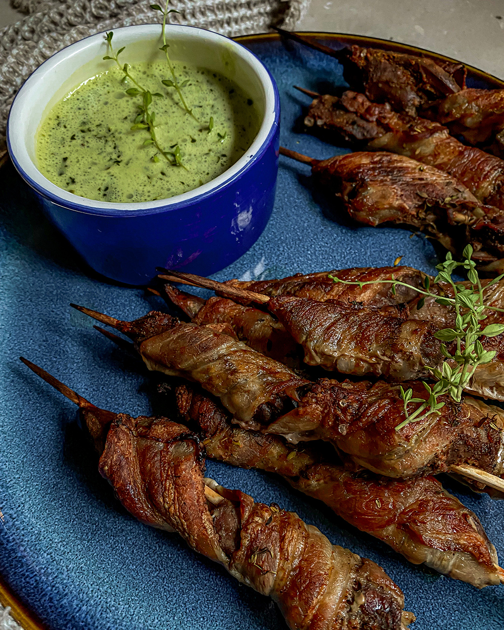 Нанизываем сердечки по 2 дольки на шпажку и обматываем одной полоской бекона.