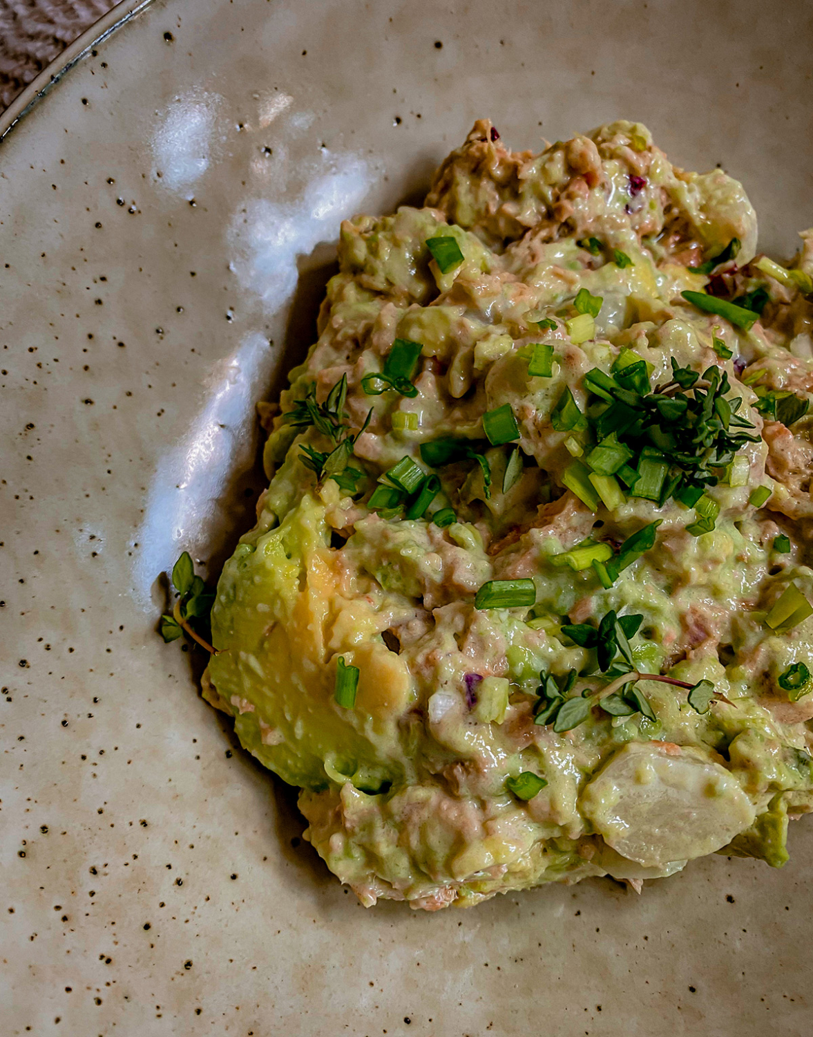 Оба вида лука рубим, добавляем все к тунцу с авокадо. Туда же специи и уксус, майонез и перемешиваем. ВСЕ!